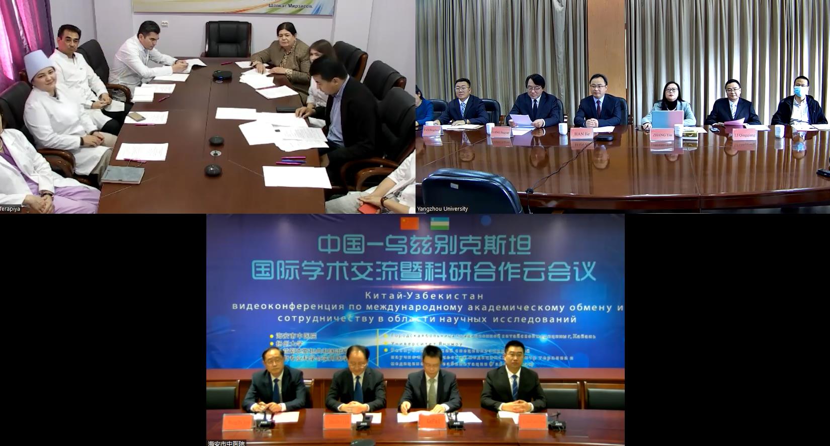 The Medical Center for Treatment and Rehabilitation of the Republic of Uzbekistan, Hai’an Traditional Chinese Medicine Hospital, Yangzhou University International Cooperation and Exchange Office, Health Science Center, Medical College, School of Nursing, and Institute of Translational Medicine attended the online meeting.