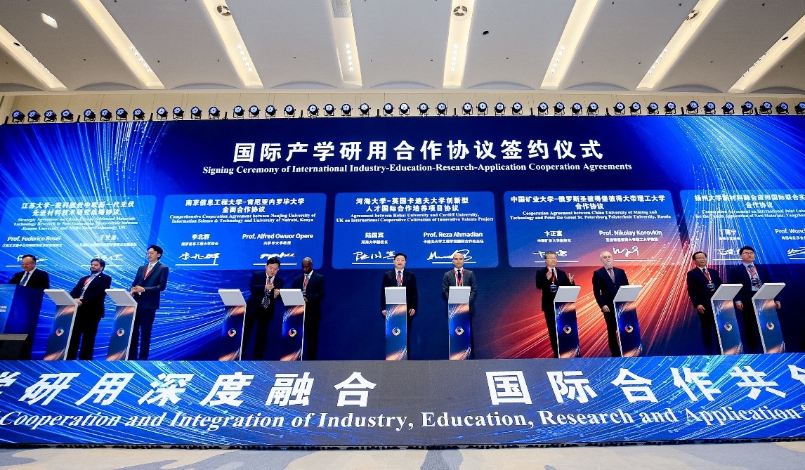 On October 30, the 2023 Jiangsu International Education Week on the Cooperation and Integration of Industry, Education, Research and Application sponsored by the Provincial Department of Education inaugurated in Nanjing. President Ding Jianning, on behalf of Yangzhou University, was present at the opening ceremony and signed international industry-education-research-application cooperation agreements with representatives from Seoul National University, Sungkyunkwan University, Nanyang Technological University as well as Chinese and overseas enterprises. Vice President Han Jie also attended the ceremony and unveiled the nameplate with delegates of Sungkyunkwan University, Kangwon National University and Nanjing Tongrentang.