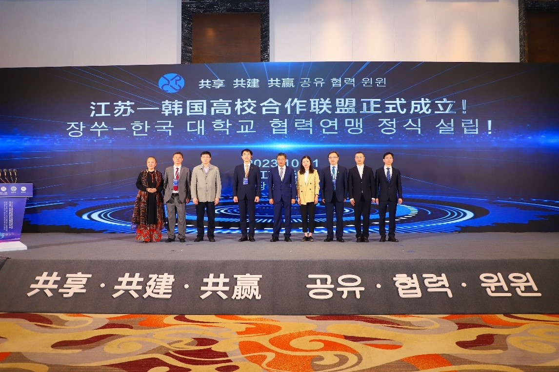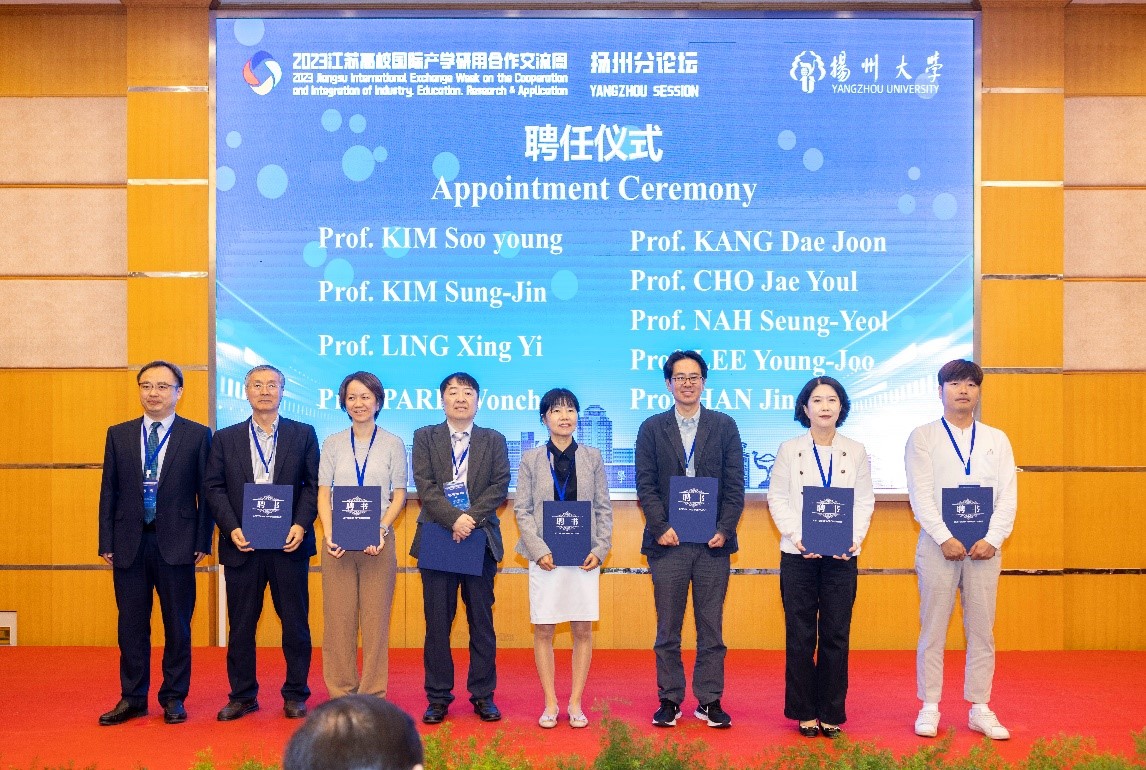 On November 1, we organized the Yangzhou session on 2023 Jiangsu International Education Week on the Cooperation and Integration of industry, education, research and application at the Lotus Pool Campus. At this session, Han Jie awarded the letters of appointment for professors from Seoul National University, Sungkyunkwan University, Jeonbuk National University, Kangwon University and Nanyang Technological University to jointly cultivate doctoral students worldwide. Three international industry-education-research-application cooperation platforms, that is, “Joint Laboratory of Intelligent Sensing and Fusion Application”, “International Joint Laboratory of Fusion Application of New Materials” and “International Joint Laboratory of Medicine-Food Homologous Industry”, signed cooperation agreements and were inaugurated. During the session, we also launched three international industry-education-research-application activities, including artificial intelligence and intelligent systems, energy-chemical-biological materials, medicine-food homologous ndustry and senile disease prevention and control. Nearly 200 people attended the event involving representatives of 9 Korean universities including Seoul National University and Sungkyunkwan University, as well as that of 6 domestic universities including Nanjing University and China Pharmaceutical University, and that of domestic and foreign enterprises including Korea Satellite Technology Research Center, Korea Advanced Radio Technology Company and Nanjing Tongrentang Pharmaceutical Co., Ltd., in addition to the leaders of departments and colleges of the university.
