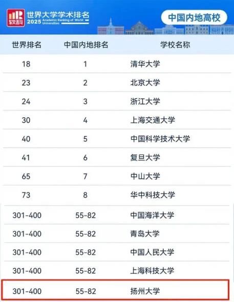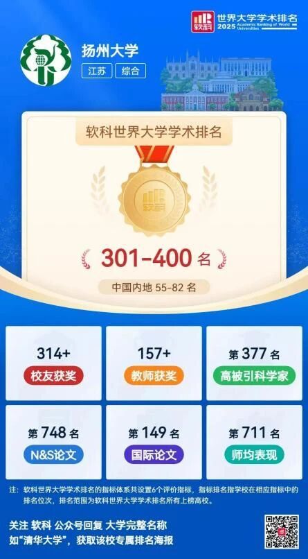 On August 15, Shanghai Ranking Consultancy officially released 2025 Academic Ranking of World Universities (ARWU). Among the 101 China mainland universities in the global top 500, YZU ranks 340th worldwide and 64th domestically. Its global position climbed 21 places year on year.