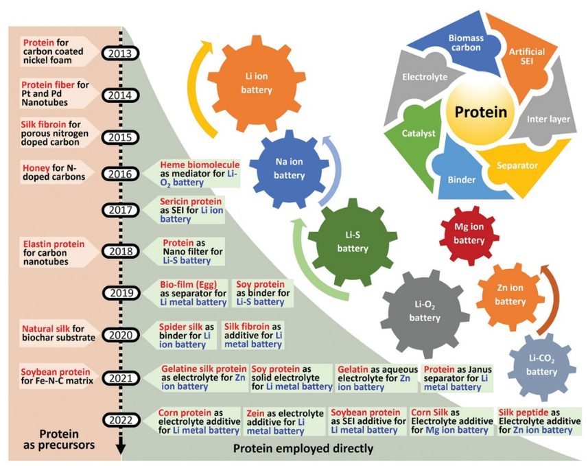 To study the working mechanism of proteins in batteries, the authors stayed focused on the quaternary structure of proteins, the effects of protein structure transitions, and different functional groups on the performance improvement of batteries, predictions and suggestions on the future development trends of proteins in batteries.