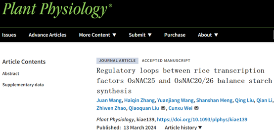 On March 13, Professor Liu Qiaoquan and Professor Wei Cunxu of Yangzhou University published a research paper entitled “Regulatory loops between rice transcription factors OsNAC25 and OsNAC20 / 26 balance starch synthesis” inPlant Physiology.The thesis reveals the positive and negative regulatory mechanisms between transcription factors OsNAC25 and OsNAC20 / 26 in stabilizing starch synthesis.