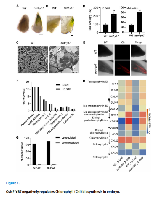 Recently, Professor Chen Chen 's research team published a research paper entitled“OsNF-YB7 inactivates OsGLK1 to inhibit chlorophyll biosynthesis in rice embryo”ineLife, revealing the molecular mechanism of rice LEC1 homologous gene OsNF-YB7 regulating rice embryo chlorophyll biosynthesis.