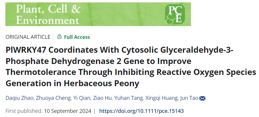 On September 10, the team led by Professor Tao Jun from College of Horticulture and Landscape Architecture published a paper with the title of PlWRKY47 coordinates with cytosolic glyceraldehyde-3-phosphate dehydrogenase 2 gene to improve thermotolerance through inhibiting reactive oxygen species generation in herbaceous peony in Plant, Cell & Environment. This study revealed the molecular mechanism by which the PlWRKY47-PlGAPC2 module inhibits the production of reactive oxygen species ( ROS ) by increasing the content of oxidized nicotinamide adenine dinucleotide ( NAD + ), thereby improving the high temperature resistance of Paeonia lactiflora.