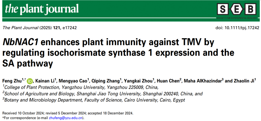 Recently, the research team led by Professor Zhu Feng from the College of Plant Protection published a seminal paper titled NbNAC1 enhances plant immunity against TMV by regulating isochorismate synthase 1 expression and the SA pathway in the internationally renowned journal, The Plant Journal. This study elucidated the molecular mechanism by which the transcription factor NbNAC1 directly regulates salicylic acid (SA) biosynthesis in response to viral infection, thereby enhancing plant immunity against Tobacco Mosaic Virus (TMV).